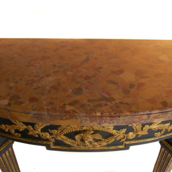 A pair of fine Antique Italian carved ebonized & gilted wood marble top demilune console tables embellished with neoclassical motifs and eagles,ca.1890's.